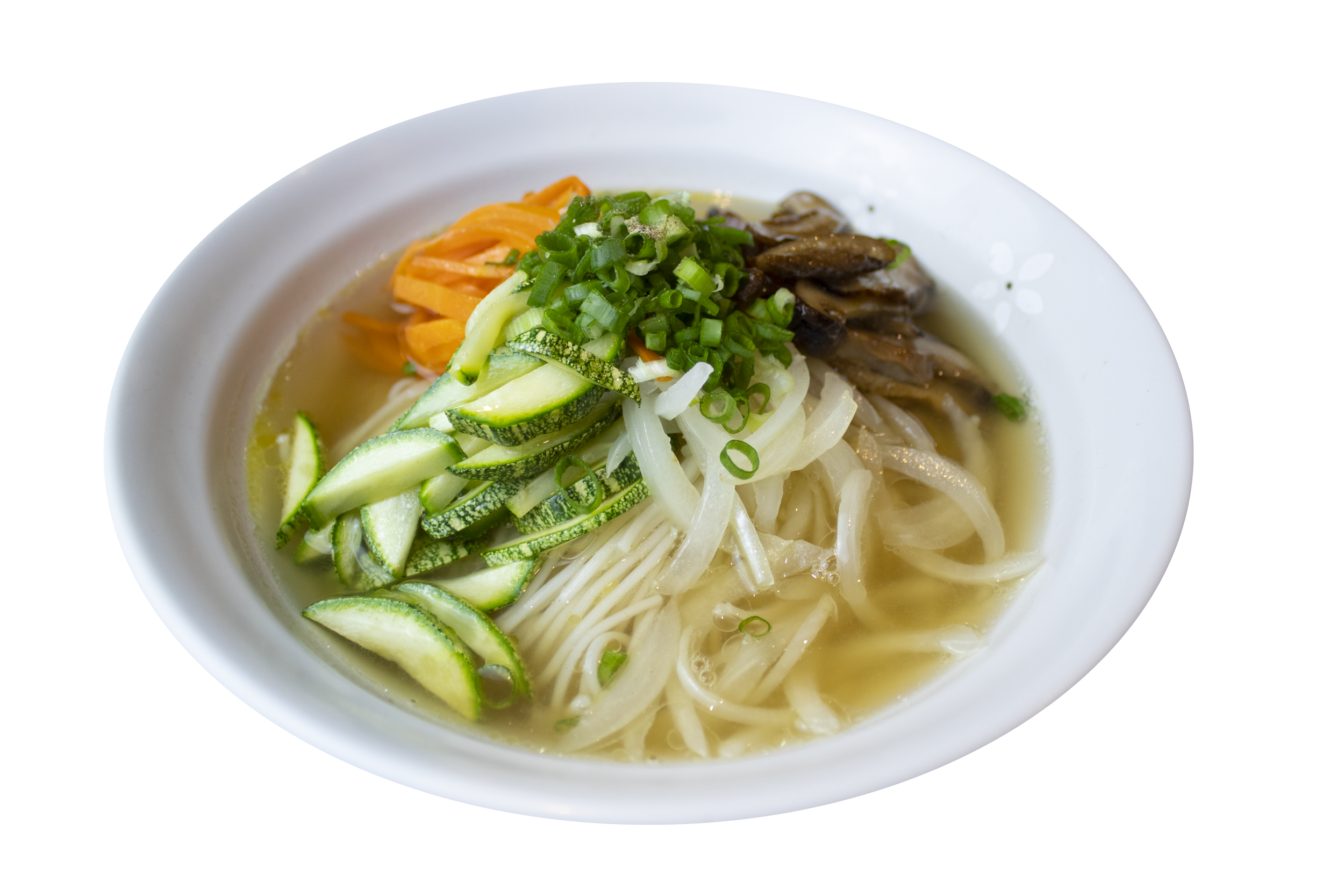 Fideos somen en caldo de anchoas con zanahoria, cebolla blanca, zapallo italiano y hongo oriental.